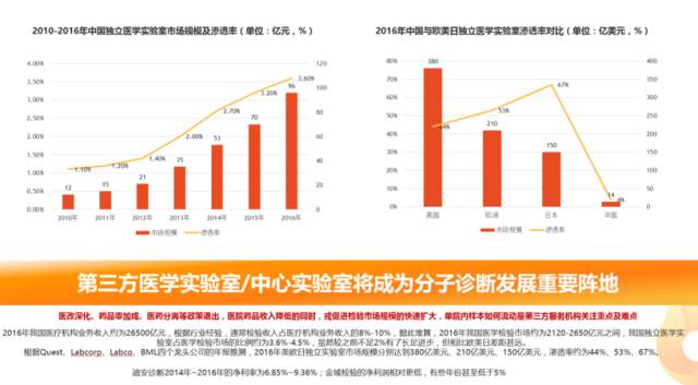 另外随着分子诊断的发展,基因芯片、PCR技术特别是高通量测序带来海量患者基因数据,为药品研发、疾病早期筛查、疾病诊断、精准用药带来新的机会,也由于海量数据处理、解读的难度为行业带来挑战。