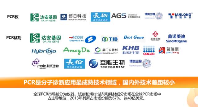 PCR是目前分子诊断领域最成熟应用,在感染病、肿瘤诊断、精准用药领域有广泛使用。全球PCR市场被分为仪器、试剂和耗材;试剂和耗材细分市场在全球PCR市场中占主导地位,2013年其所占市场份额为67%、达40亿美元。CFDA共批准PCR技术838个产品,国内龙头企业(达安基因、之江生物、艾康生物、鑫诺美迪、亚能生物、复星长征等)基本完成产品的进口替代,国内外差距在逐步缩小。