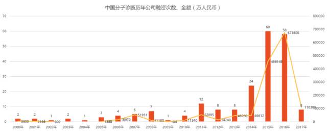 截止2017年7月中国分子诊断行业共披露融资次数210次,其中明确披露具体融资金额的有134笔,披露融资总金额为150.9亿元人民币,单笔融资额超过亿元人民币的有44笔。