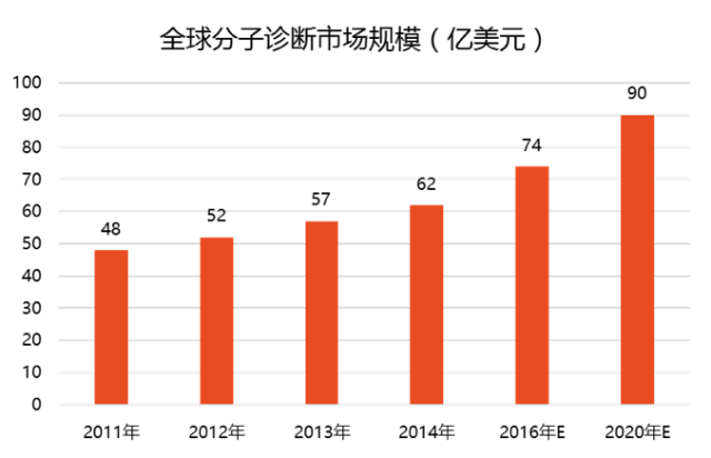 全球范围内分子诊断市场发展迅速在2014年达到62亿美元,有望2020年达到90亿美元。市场格局相对集中,由Abbott 、Hologic Inc.、Qiagen、Siemens四大天王,以及AsuraGen、Ahram Biosystem、Analytik Jena、BD、Bio-Rad等行业巨头共同瓜分。